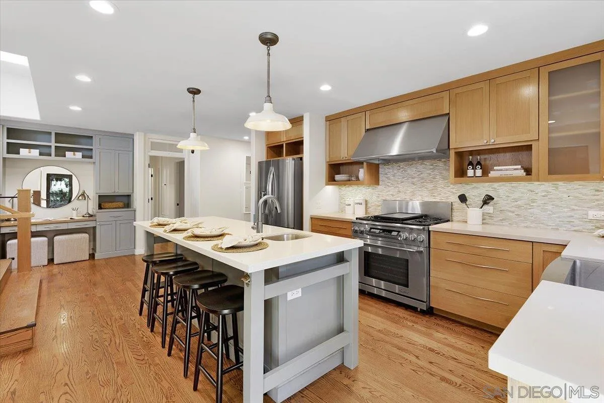 Welcome to 1040 Novara Street, a stunning luxury residence nestled in the highly desirable neighborhood of Sunset Cliffs. This exceptional home boasts 4 bedrooms, an office, and an exercise room, offering a versatile layout that accommodates a variety of lifestyles. Step inside and be captivated by the expansive 3,291 square feet of living space, where modern elegance meets unparalleled functionality. Enjoy panoramic sit-down ocean views from the living room, creating a serene and picturesque backdrop for daily living. Cook, gather, and entertain in the gourmet kitchen, featuring a large island with a "prep" sink, a top-of-the-line Dacor range, wine fridge, and a spacious walk-in pantry featuring a dutch door. The primary suite is a private sanctuary, offering impressive ocean views that can also be enjoyed from the balcony. The primary bathroom is complete with a marble tub surround, separate shower enclosure, and dual vanities. The custom closet system adds a touch of sophistication and ample storage space. The primary also features a loft space with multi-purpose use. The downstairs bedroom can be creatively utilized as an ADU, playroom, living room, or teen retreat, providing flexibility and convenience for your needs. Enjoy the large private enclosed deck which creates the ultimate space to dine al fresco and entertain. The newly landscaped front, back, and side yards include new irrigation, artificial grass, lighting, a Sonos sound system, fencing, making outdoor living an absolute pleasure.