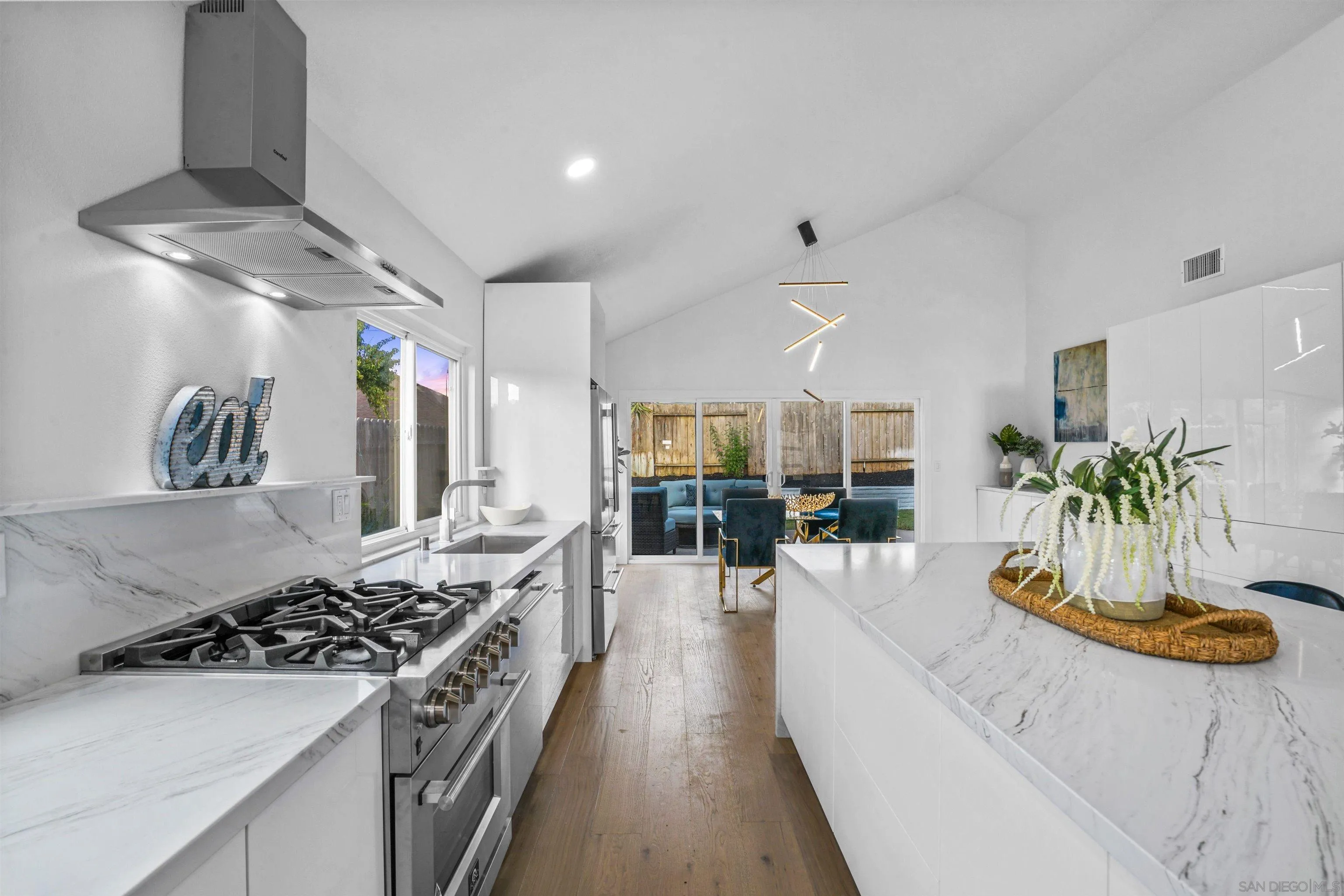 Nestled on a tranquil cul-de-sac within a family-friendly community, this charming single-story residence, spanning 1,830 square feet, has undergone a stunning transformation from top to bottom. Boasting 4 spacious bedrooms and 2 modern baths, this home has been thoughtfully reimagined by a designer to encapsulate the contemporary living experience everyone covets. Upon entry, you'll immediately notice the newly vaulted ceilings and expansive dual-paned windows, which flood the interior with an abundance of natural light, creating an inviting and airy atmosphere. The color palette has been meticulously chosen to soothe the senses, providing a harmonious backdrop for your daily life. Step onto the brand-new, waterproof Luxury Vinyl Plank (LVP) flooring, complemented by fresh interior and exterior paint. The family room, featuring a cozy gas fireplace, seamlessly merges with the gourmet kitchen, showcasing European cabinets and top-of-the-line Forno gas appliances. At the heart of this home lies a magnificent 52' x 103' quartz island, an entertainer's dream. Adjacent, you'll find a spacious dining area illuminated by a chic modern light fixture and an abundance of storage options for all your kitchen needs. The bathrooms are true works of art, featuring exceptional tile craftsmanship, new vanities, mirrors, and exquisite showers. The master bathroom stands out with its dual vanities and a contemporary freestanding tub, creating a spa-like oasis for relaxation. Additional features include a convenient 2-car garage with ample storage, a new flat roof, updated interior doors,